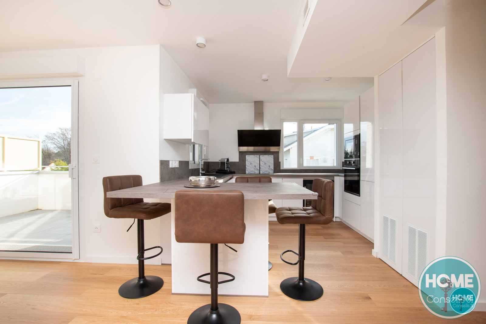 L'espace séjour, d'environ 40 m² est baigné de lumière grâce à ses baies vitrées donnant accès à une belle terrasse sans vis-à-vis de 9m² exposée sud-est, un séjour et une cuisine ouverte, entièrement équipée et très conviviale grâce à son ilot et ses prestations haut de gamme (cave à vin, hotte à évacuation extérieure, plaques à induction...).